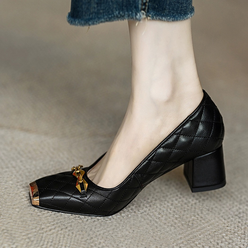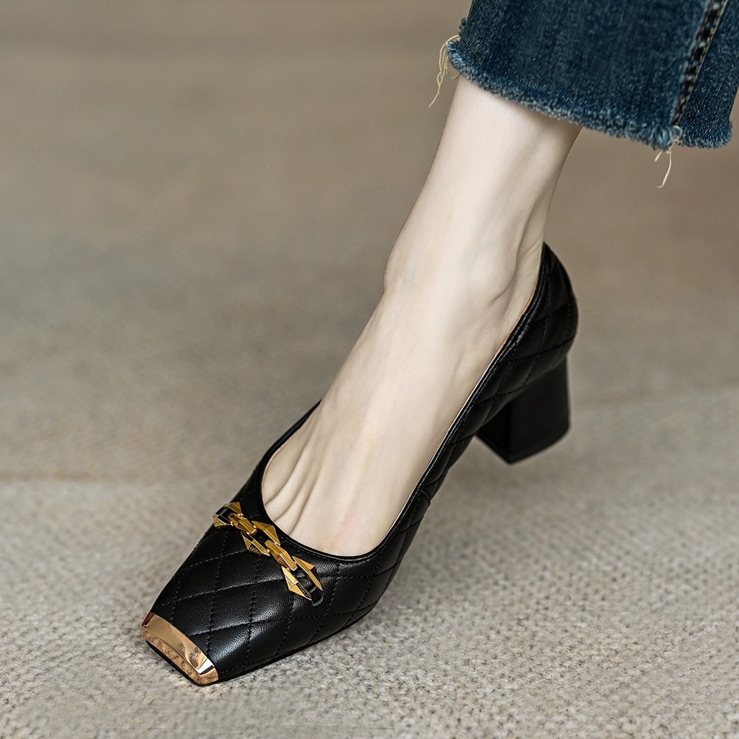 2025 Spring And Autumn New French Retro Square Head Thick Heel Metal Chain Small Leather Shoes Coarse Heel Soft Back Grandmother Single Shoes HZ0115