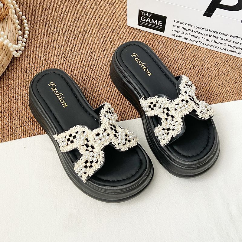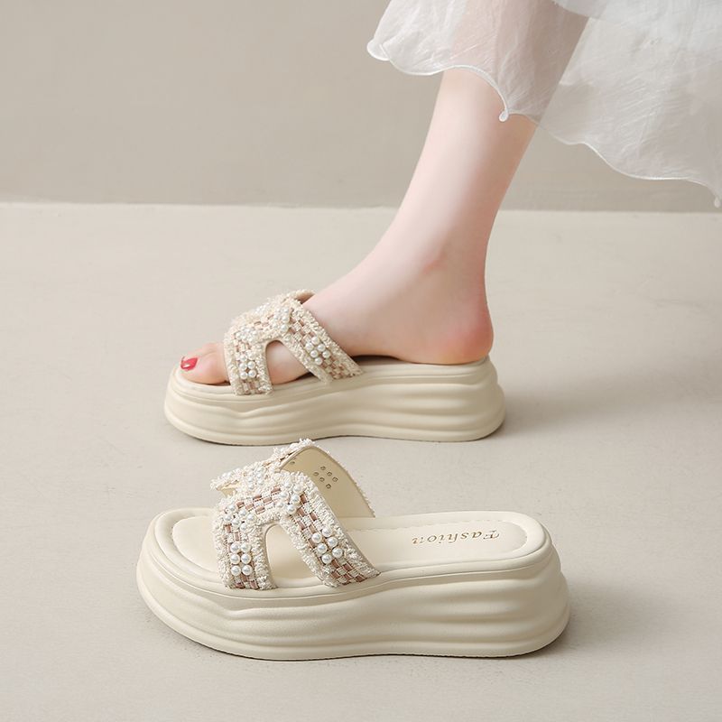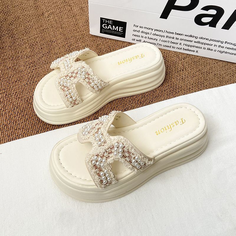 Daily High-Level Pearl Slippers Women's Summer Net Red Explosion Wearing Small Fragrant Wind Thick-Bottomed Drag Fashion Cool Slippers HZ0115