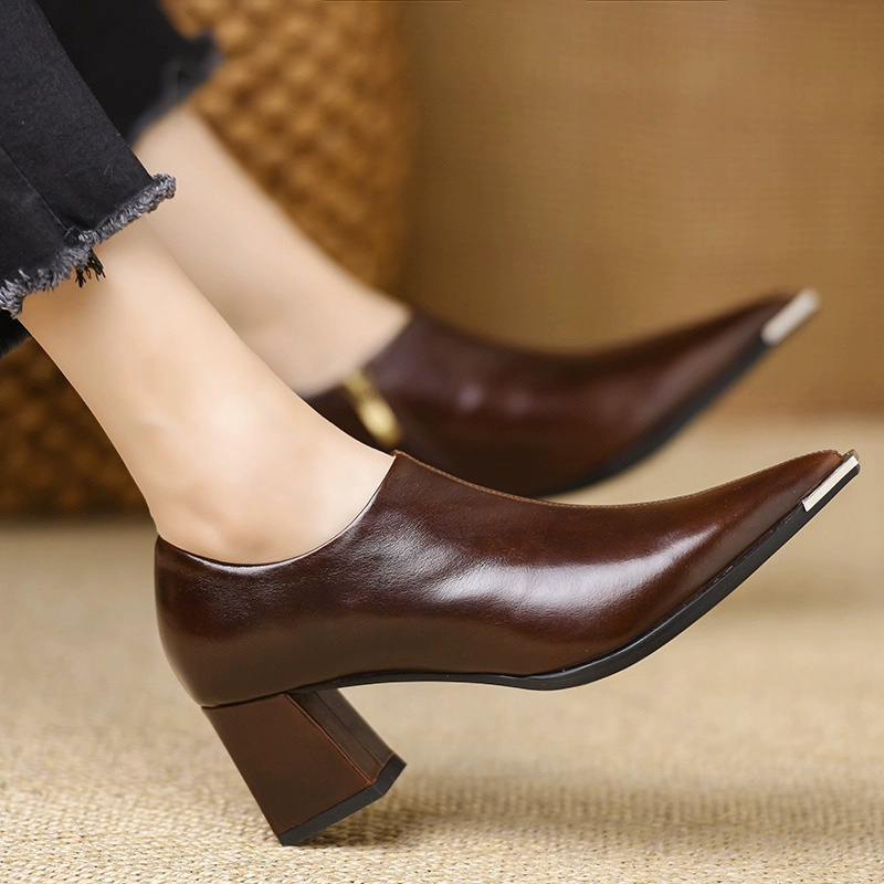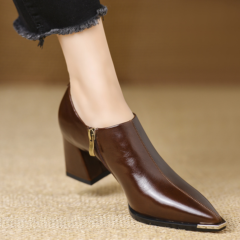 French Temperament With Comfortable Side Zipper Is Not Tired British Style Retro Leather Shoes Tips Deep Mouth Coarse Single Shoes HZ0115