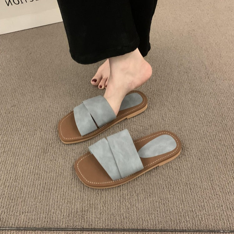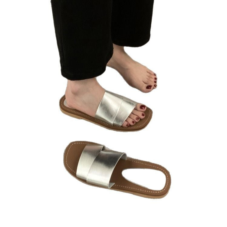Small Design Sense Retro Square Toe Flat-Bottom Slippers Women Wearing Fairy Wind Seaside Resort Beach Cool HZ0115